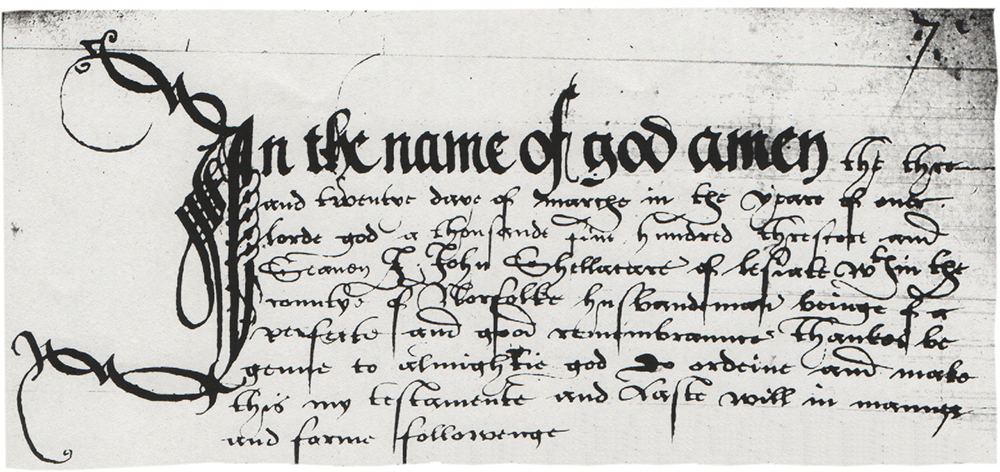 In the name of God amen the twenty-third of March1 in the year of our Lord God a thousand five hundred and threescore and seven2 – I, John Shellacare of Leziate3, within the County of Norfolk, husbandman4, being of perfect and good remembrance, (being of sound mind) thanks be given to almighty God do order and make this my Testament and Last Will in (the) manner and form as follows |