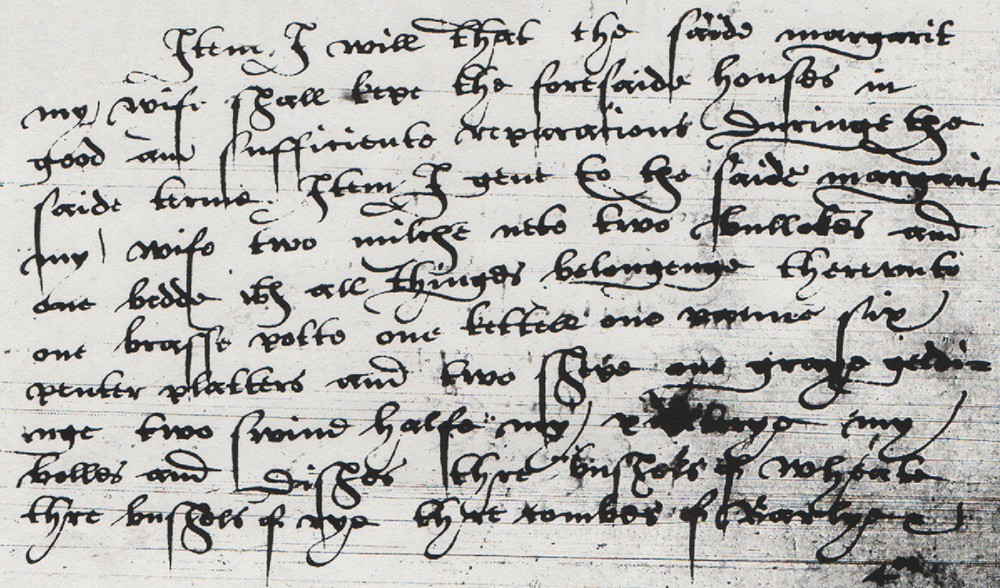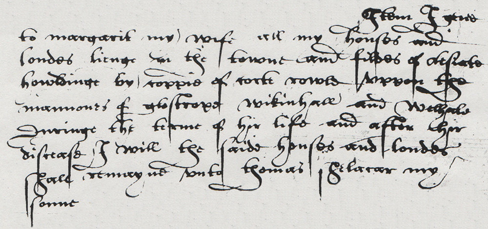 | Item I geve to margarit my wife all my houses and londes lienge in the towne and feldes of Lesiate howldinge by coppie of corte rowle uppon the mannours of glostrope Wikinhall and Welhale Duringe the terme of hir life and after hir discease I will the saide houses and londes shall remayne unto thomas shelacar my sonne |