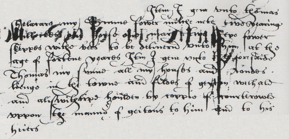 | Itm I geve unto thomas shelacare my Sunne fower milche nete two yearing bullockes [?] one horse one mare two shepe fower skeppes withe bees to be delivered unto him at the age of fortene yeares. Item I geve unto the aforesaide Thomas my sunne all my houses and Londes lienge in the towne and feldes of geyton welhale and aliswithtrpe houlden by coppie of courterowle uppon the mannor of geitons to him and to his heiers |