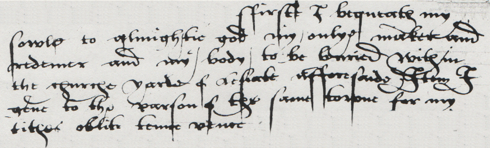 | Firste I bequeath my sowle to almightie god my onlye maker and redemer and my body to be buried within the churche yarde of Lesiate afforesaide. Item – I geve to the parson of the same towne for my tithes oblite tenne pence |