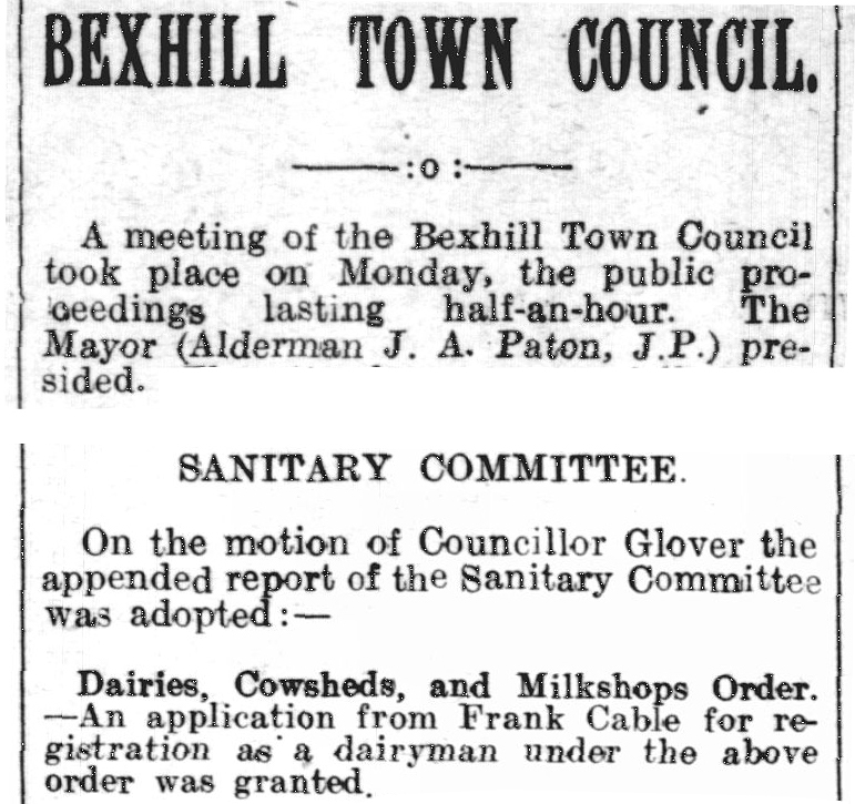 Four months after Frank Cable acquired the dairy his application to be registers as a Dairyman is granted by the Sanitary Committee at a town council meeting in Bexhill.