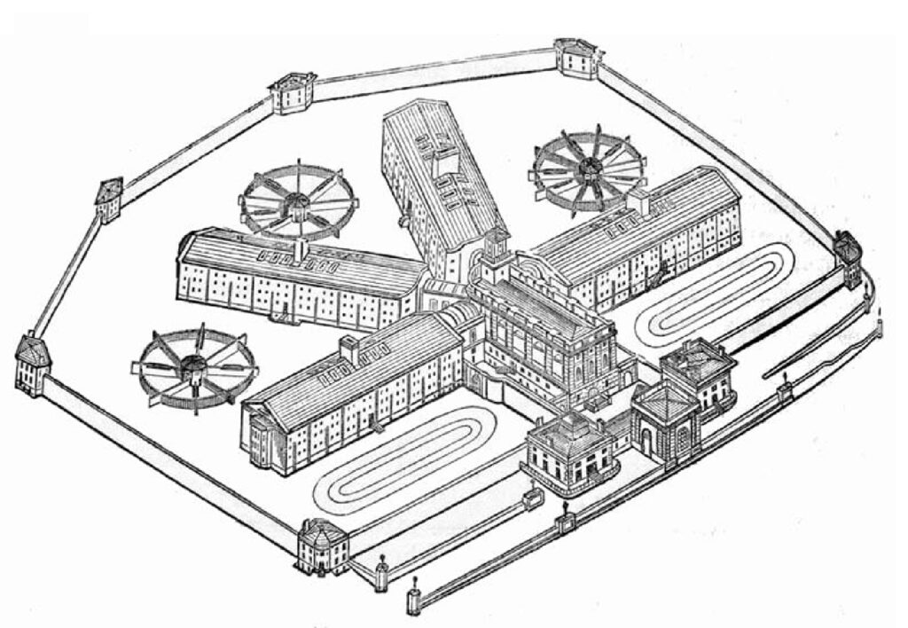 Lewes Prison was a men’s local prison in Sussex and was built between 1850 and 1853 on a site west of the town. The design of which followed the model of Pentonville prison in having a central hall, with four wings around a half-octagonal central block. As shown on the diagram on the right. These four wings separately housed males, females, vagrants and juveniles and debtors.