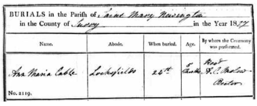 However, the newborn daughter, Ann Maria, died at the age of 5 months. She was buried on 24th August 1817. Her abobe is recorded as Locksfields.