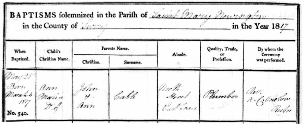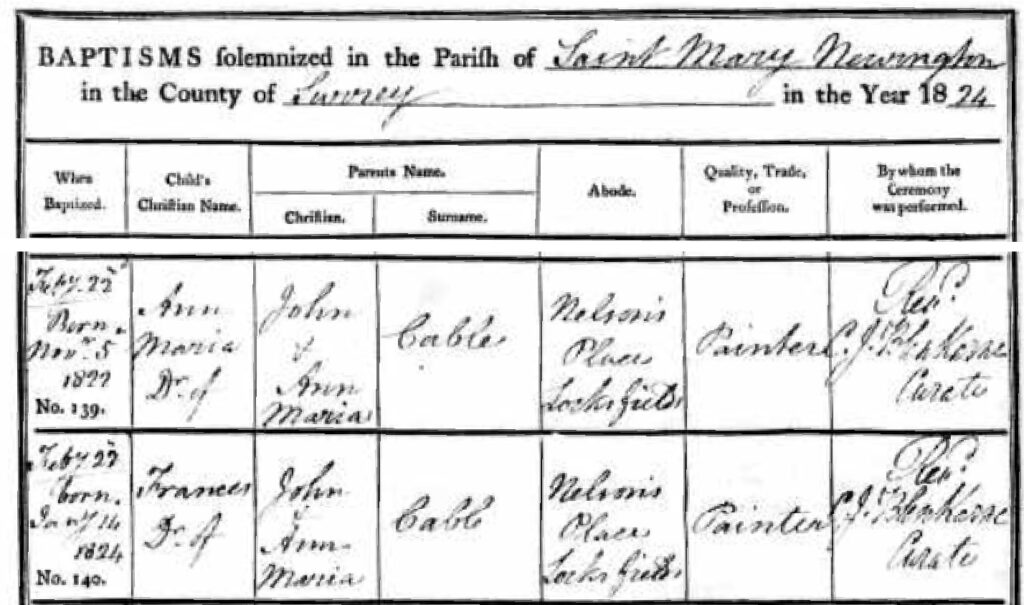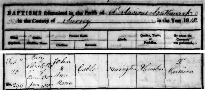 On this record her abode is recorded as ‘Newington’ with no street name shown. The church in which this baptism took place is not St Mary Church in Newington, it is now St. Saviour, Southwark. This is the same church in which the firstborn, Henry Isaac Cable was baptised.