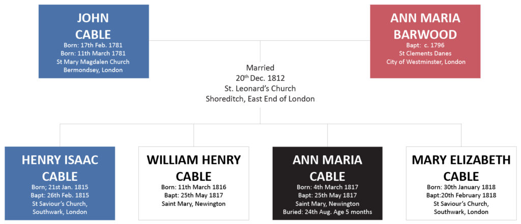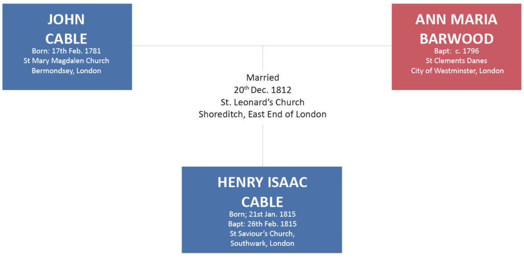 Henry’s father, and Frank Brown/Cable’s grandfather, was JOHN CABLE, his mother – ANN MARIA CABLE. Her maiden name was ANN MARIA BARWOOD, and she was born in 1796 to Henry and Ann Barwood and baptized at St Clements Danes, Westminster. JOHN CABLE & ANN MARIA BARWOOD married on Sunday 20th Dec 1812 at St Leonards Church, Shoreditch, London.