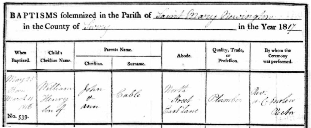 Henry was the first of a very large number of children born to John and Ann Maria Cable. Their second child, also a son, was born on 11th March 1816 and was baptised the following year, on 25th May 1817. He was named WILLIAM HENRY CABLE. John Cable’s occupation was recorded as ‘Plumber‘. At this time the family lived at North Street, East Lane. The baptism took place at St Mary Church in Newington.